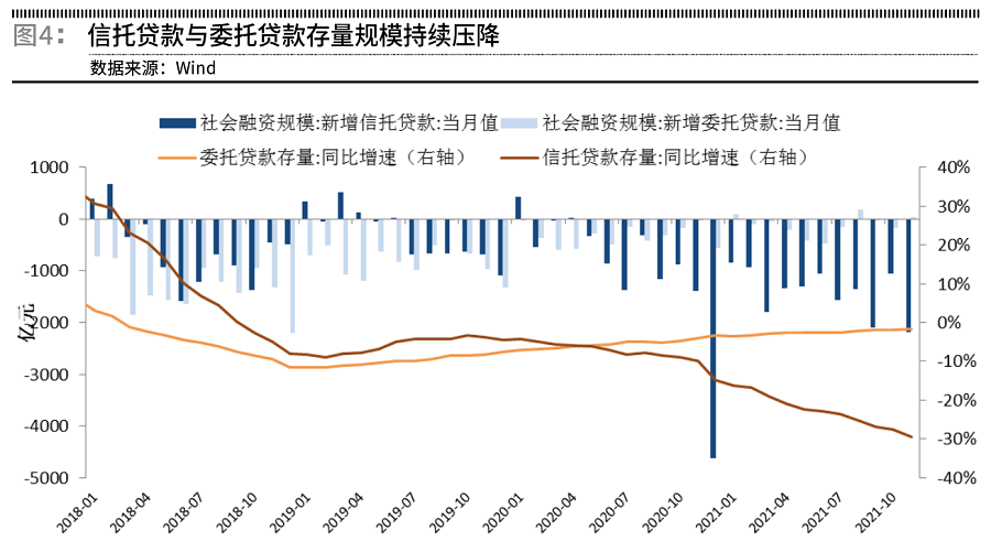 随着非标监管政策趋严,2021年非标规模延续压降趋势,委托贷款存量规模由2020年年末的11.06万亿元下降至11月末的10.92万亿元,信托贷款存量规模由2020年年末的6.34万亿元下降至11月末的4.81万亿元。