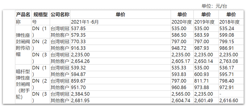 可以看到,对于相同品名且相同规格的产品,冠龙股份销售给台湾明冠产品单价与销售给无关联第三方的产品单价存在一定的差异。以完整年度2020年为例,公司销售给台湾明冠的弹性座封闸阀DN(1)、DN(2)和DN(3)单价分别为535元/台、797元/台和2235元/台;同期,公司销售给其他客户的相同产品单价分别为586.5元/台、948.72元/台和2605.17元/台。冠龙股份对关联方台湾明冠的销售单价要明显低于其他客户,差额分别为51.5元/台、151.72元/台和370.17元/台。