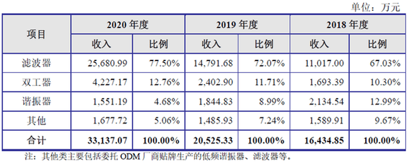 招股书显示,2018-2020年,好达电子实现营业收入分别为1.65亿元、2.06亿元、3.32亿元;实现净利润分别为2880.42万元、2886.52万元、4680.35万元。