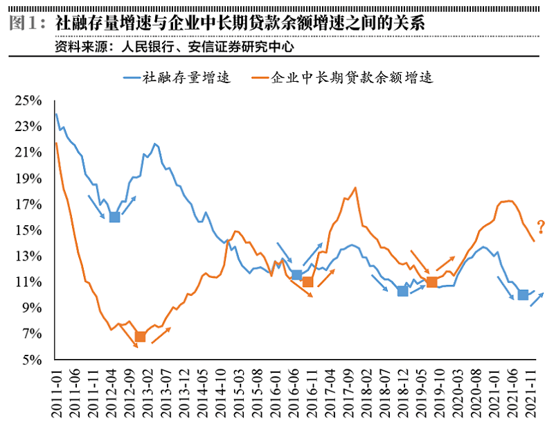 而从“信用扩张”到“有效信贷需求回升”,往往会存在时滞,根据历史经验:当社融存量增速从收缩转向扩张后,企业中长期贷款增速也将大概率企稳回升,时滞大概在3个月至7个月左右;并且在社融存量增速底部往上的阶段,企业中长期贷款增速降幅也会明显收窄;当前阶段,2021年9月末,社融存量增速为10%,为这一轮社融增速的底部,目前信用重启扩张,传导至有效信贷需求回升可以更加乐观一点。