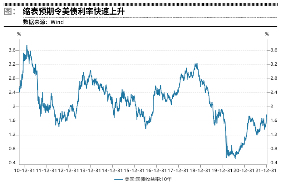 2021年12月中旬以来,10年期美债利率快速从1.41%上升到1.78%附近,对双紧缩预期反应较为强烈。