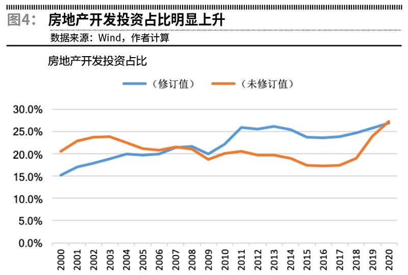 将固定资产投资数据大幅下修、但对房地产开发投资数据不做调整,其结果就是房地产开发投资占整个投资的比重明显上升,有的年份占比抬高了超6个百分点,过去十年,这一比重基本稳定在25%左右。