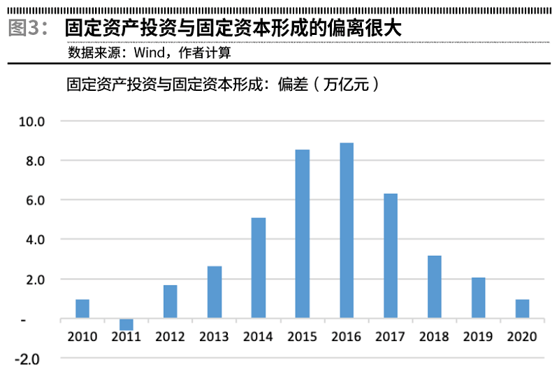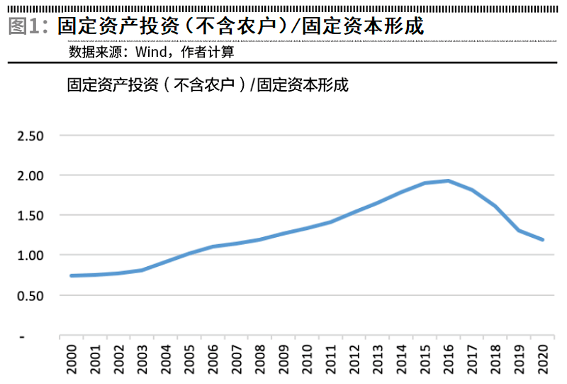 导致这种背离的主要原因,是之前统计数据水分太大。我们计算固定资产投资(不含农户)与固定资本形成总额的比值,可以看到这个比值在2000年后的头几年是低于1的,但之后就快速上升,尤其是金融危机后的几年,随着增长率下行、稳增长压力加大,固定资产投资与固定资本形成的偏离也越来越大,到2016年已经达到1.92倍。