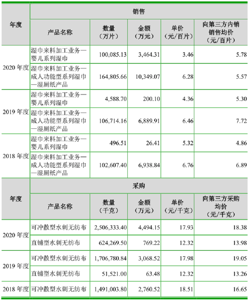 以2019年为例,洁雅股份向金佰利集团销售婴儿系列湿巾和成人功能型系列湿巾单价分别为4.36元/百片和6.46元/百片,向第三方销售均价分别为5.30元/百片和7.72元/百片;洁雅股份向金佰利集团采购可冲散型水刺无纺布和直铺型水刺无纺布单价分别为17.98元/千克和12.32元/千克,向第三方采购均价分别为19.05元/千克和13.26元/千克。