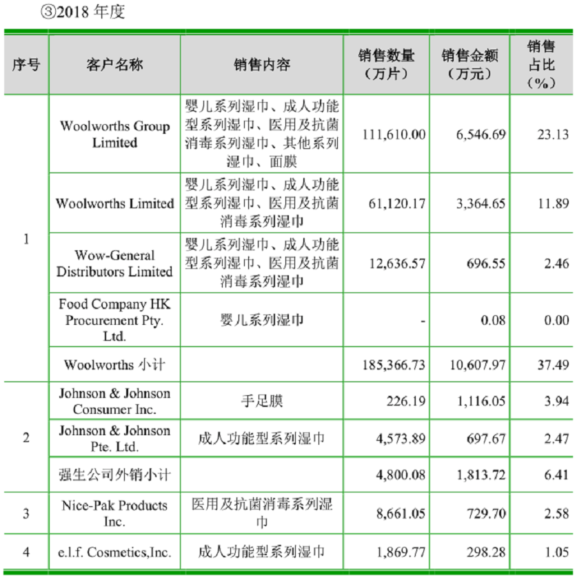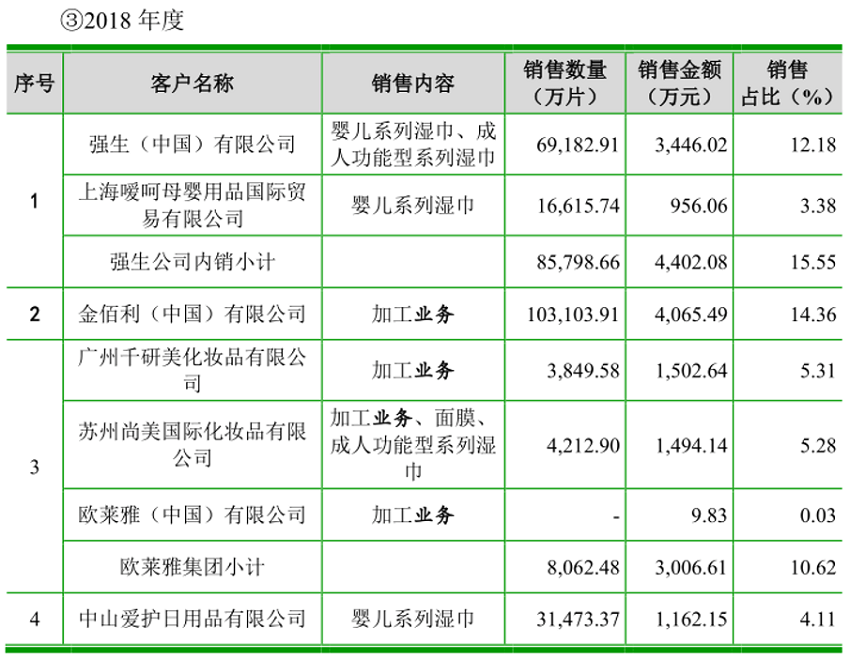 可以看到,2018-2020年,公司湿巾加工业务收入金额分别为4065.27万元、4113.54万元和8310.38万元。在首轮问询函回复中,洁雅股份披露了2018年公司内销前五名客户销售情况,如下表所示: