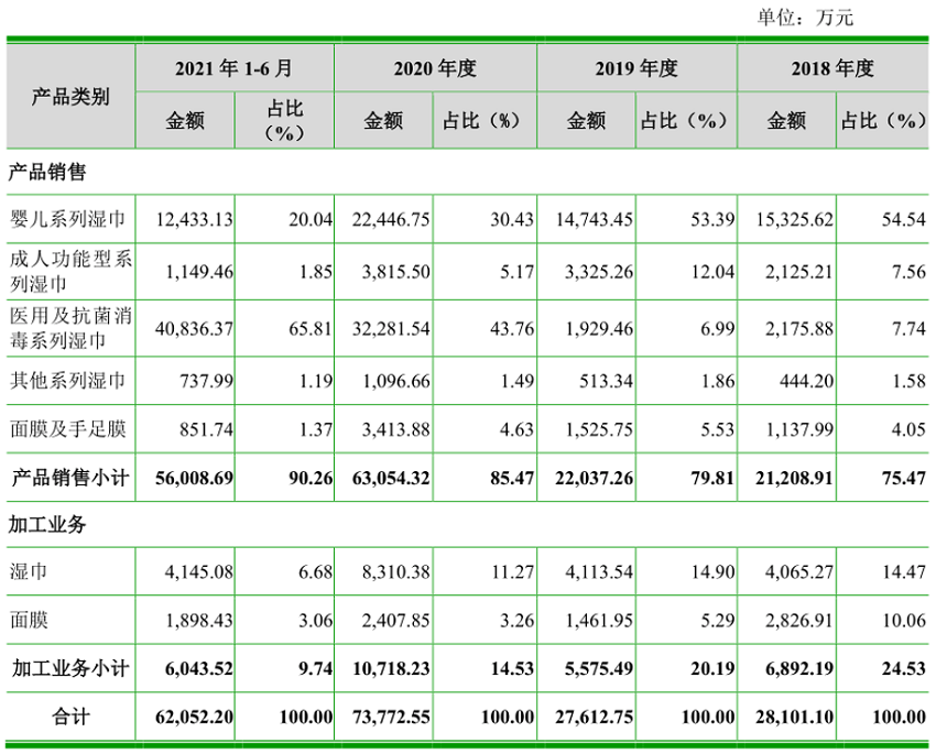 除了手足膜产品销售额披露出现矛盾外,洁雅股份对于湿巾加工业务收入金额披露同样存在问题。招股书显示,报告期内,公司的主营业务收入构成情况如下表: