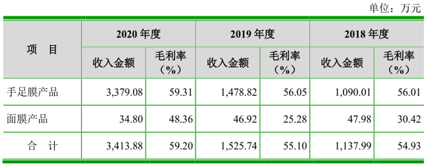 信披文件显示,报告期内,洁雅股份面膜及手足膜产品构成及毛利率情况如下表: