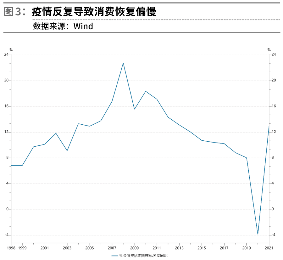 在2020年底时,市场普遍预计,随着疫情得到有效的控制,2021年的消费增长会逐步恢复到疫情前水平。但现实的情况却让人大跌眼镜,2021年消费的恢复依旧非常缓慢,也成了拖累经济的主要原因之一。