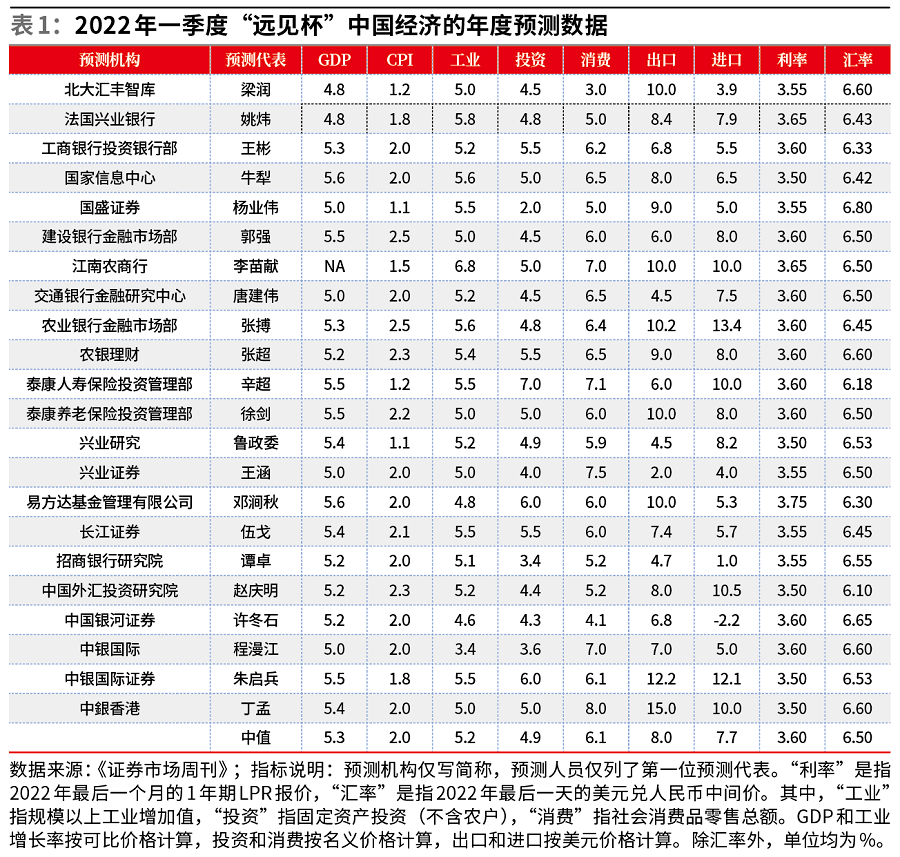 疫情对经济的冲击能否缓和,房地产能否软着陆,稳增长的政策能否力挽狂澜?1月底由《证券市场周刊》发起的“远见杯”宏观经济与金融市场预测调查(下称“远见杯”预测)显示,机构们对2022年中国GDP增长的预测中值为5.3%,意味着机构们对“保五”并不悲观。