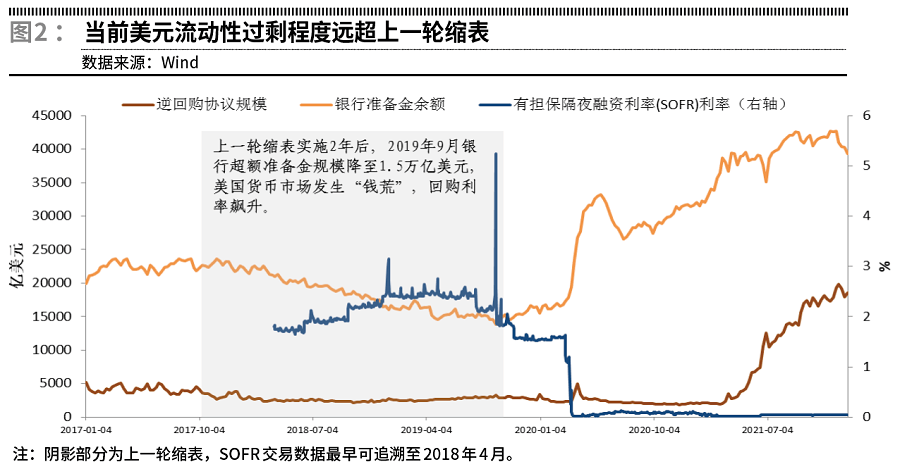 二是当前美元流动性过度充裕。2021年末美联储资产规模达到8.8万亿美元,而上一轮缩表前资产规模仅为4.5万亿元。当前美联储总资产占美国GDP的比重高达37%,远超上一轮缩表前的23%。美联储资产规模膨胀与结构异化将削弱美联储的货币供给与逆周期调控能力,随着经济企稳,美联储需要削减其资产规模,使其占GDP的比重回到长期合意水平,为应对未来的冲击留出足够的政策空间。目前美联储隔夜逆回购工具(O/N RRP)的使用规模接近1.9万亿美元,远高于上一轮缩表前的4550亿美元;银行体系准备金规模为4万亿美元,远高于上一轮缩表前的2.2万亿美元。当前美元流动性泛滥的程度远超于上一轮缩表前的水平,能在缩表初期轻松吸收流动性收缩对金融体系的冲击。