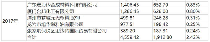 可以看到,2017年卓越新能对第十大客户厦门台邦化工有限公司销售额为628万元,销售产品为生物柴油。这一数据与问询函中披露的数据(即:对生物柴油境内第二大客户厦门台邦化工有限公司销售金额628.00万元)完全一致。由此可知,2017年卓越新能生物柴油境内第一大客户广东宏力达合成材料科技有限公司理应排在厦门台邦化工有限公司之前。