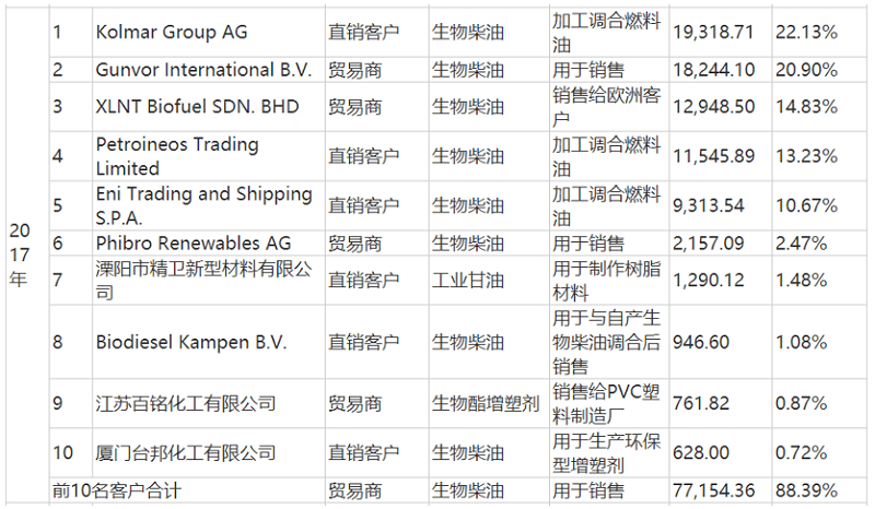 2017年度销售数据披露的问题则更为严重。在首轮问询函回复中,卓越新能披露了2017年公司生物柴油境内前五大客户如下表: