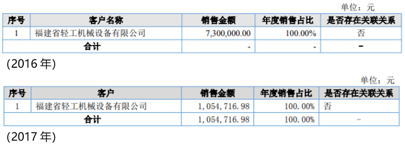 其中,厦门卓越生物质能源有限公司作为瑞科际的第三大客户,为瑞科际贡献了816.6万元的销售收入,这一数据与卓越新能披露的2018年向瑞科际采购额相匹配。然而,2016年和2017年却并非如此,瑞科际2016年和2017年年报披露的公司主要客户情况如下表: