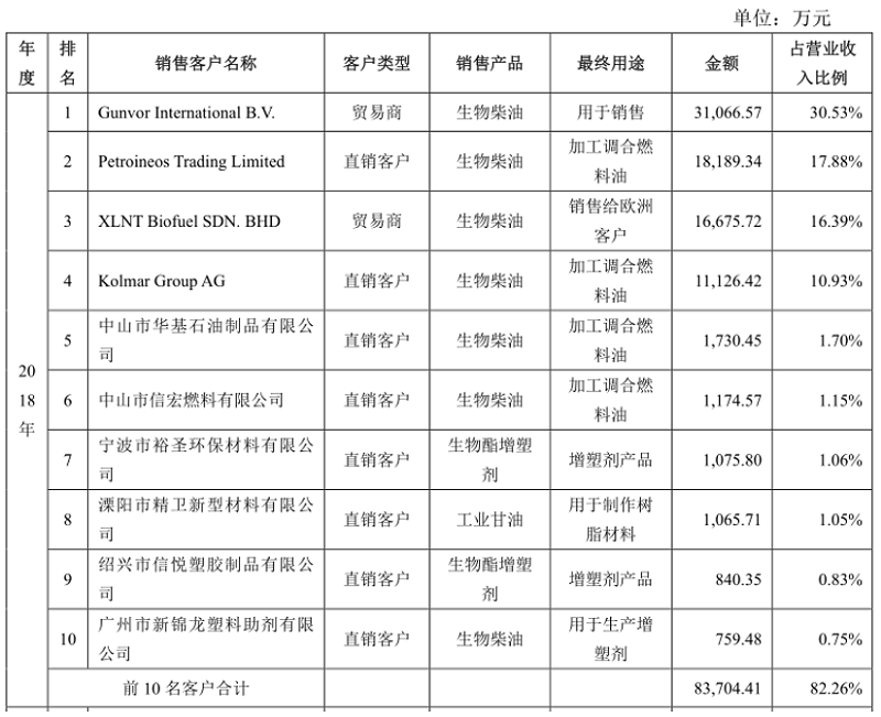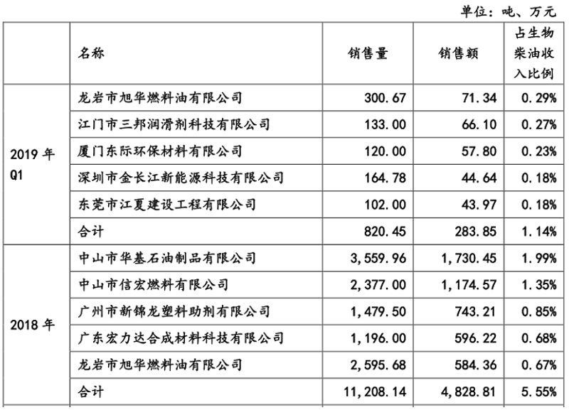 可以看到,2018年卓越新能对中山市华基石油制品有限公司、中山市信宏燃料有限公司和广州市新棉龙塑料助剂有限公司销售金额分别为1730.45万元、1174.57万元和759.48万元,销售产品均为生物柴油。在首轮问询函回复中,卓越新能披露的2018年公司生物柴油境内前五大客户如下表所示: