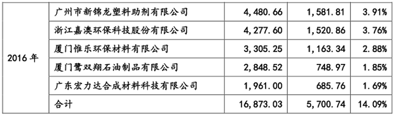 如上表所示,2016年卓越新能对广州市新棉龙塑料助剂有限公司、浙江嘉澳环保科技股份有限公司、厦门惟乐环保材料有限公司和厦门鹭双翔石油制品有限公司销售金额分别为1581.81万元、1520.86万元、1163.34万元和748.97万元,与招股书中披露的数据(1581.81万元、1520.86万元、1194.93万元和748.97万元)并不完全匹配;其中,对厦门惟乐环保材料有限公司的销售金额,在两份信披文件中披露并不一致。