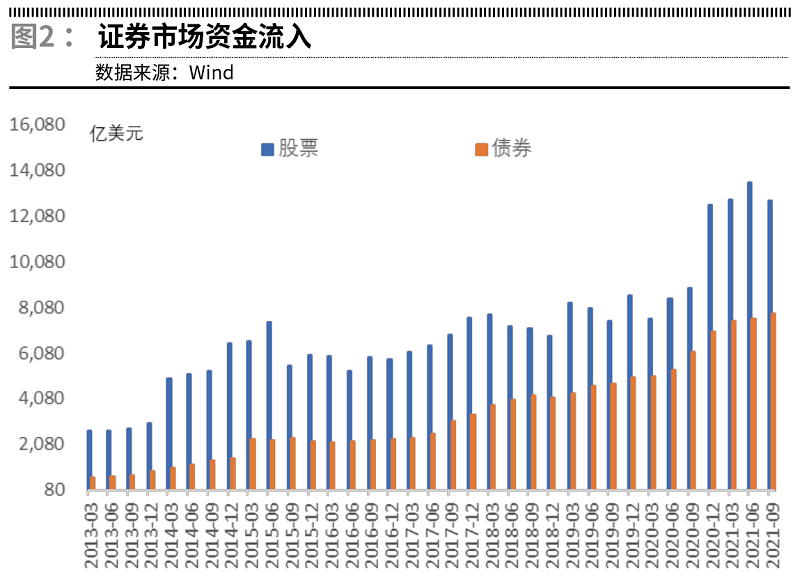 股票类项目部分实现可兑换,境外企业在境内交易所发行以人民币计价的股票仍未实现突破,沪港通、深港通渠道是境内外双向投资参与的重要渠道。截至2021年三季度末,境外机构持有中国市场股票规模达1.3万亿美元,其中约七成为港股通渠道交易。