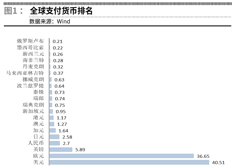 美元是全球大宗商品最主要的计价货币。根据联合国贸易和发展会议(UNCTAD)发布的全球商品序列,截至2021年11月末的42种主要出口商品中,29种以美元计价,11种以欧元计价,其他以指数计价。
