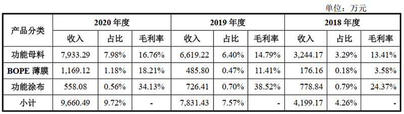 第二轮问询回复显示,报告期内,德冠薄膜功能母料销售收入分别为3244.17万元、6619.22万元和302.19万元,功能涂布销售收入分别为778.84万元、726.41万元和10.98万元,BOPE薄膜销售收入分别为176.6万元、485.8万元和96.3万元。