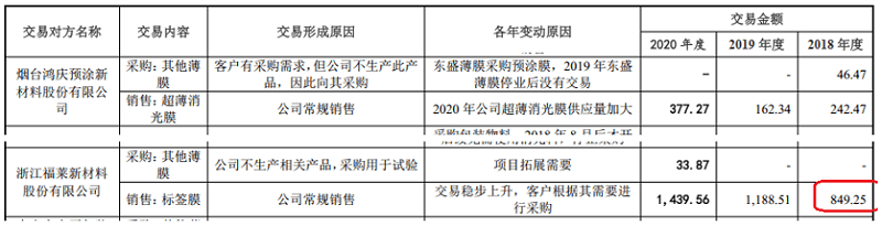 但第二轮问询关于“报告期内存在的既销售又采购的具体情况”的回复却显示,2018年,德冠薄膜向福莱新材销售标签膜的金额为849.25万元,比招股书所披露结果少了1154.09万元。