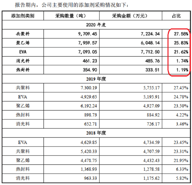 首轮问询问题10回复显示,德冠薄膜主要使用的添加剂包括共聚料、聚乙烯、EVA、热封料和消光料等。报告期内,德冠薄膜主要使用的添加剂采购情况如下表所示: