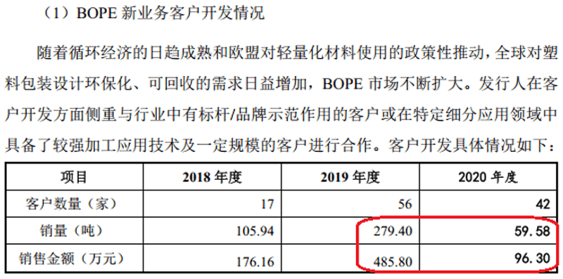 此外,审核中心意见落实函回复显示,2019年及2020年,德冠薄膜BOPE薄膜销售量分别为279.4吨和677.69吨。