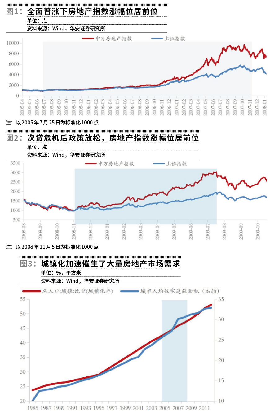 2008年11月9日国常会宣布了“四万亿”投资计划,央行也连续降准降息予以配合。与此同时,政策端放松了对房地产的调控。在经济强刺激政策下,A股在2008年11月初到达底部,开始新一轮行情,这轮行情仍然属于经济复苏的盈利修复叠加估值修复双驱动行情,各行业指数普涨。申万房地产指数由2008年11月4日的1382.41上涨到7月28日的4356.54点,涨幅为179.83%,强于上证89.53%,在31个申万一级行业中居第四位,排行前五的行业分别是有色金属、煤炭、汽车、房地产、建筑材料。