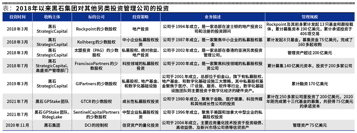 如2018年3月,黑石BAAM部门专门投资于其他另类投资管理公司少数股权的GP权益基金Strategic Capital Holdings Fund宣布将投资于太盟投资(PAG)的少数股权,太盟是一家总部在中国香港的亚洲另类投资管理公司,于2002年成立,管理资产超过200亿美元,有私募股权、绝对收益、地产等几大投资策略。2018年7月,Strategic Capital又联合高盛资产管理部门共同投资于Francisco Partners的少数股权,Francisco Partners于2000年成立,是一家聚焦科技领域的私募股权投资公司,已累计募集资本140亿美元,投资于200多家公司,是科技领域最活跃的投资人之一。2019年3月,Strategic Capital又宣布将投资于GI Partners的少数股权,GI于2001年成立,总部位于旧金山,已累计募集资本170亿美元,旗下有私募股权、地产基金、和数字化基础设施三大策略,其中私募股权基金聚焦于医疗、IT设施、服务、软件等行业,数字化基础设施团队则主要投资于数字化经济的硬件资产。2021年7月,黑石GP Stake团队再下一城,宣布将收购GTCR的少数股权,GTCR于1980年成立,是一家成长性股权的私募投资公司,聚焦于金融、医疗健康、科技传媒和其他成长性公司的股权投资,自成立以来已累计在250多家公司里投资了200亿美元,2020年GTCR刚完成第十三代基金的募集,共获得75亿美元的承诺资本。上述GP权益基金通过广泛投资于有潜力的第三方另类投资管理公司的少数股东权益,在为LP投资人贡献收益的同时,也是黑石自身战略布局的一部分,它为黑石提供了一个近距离接触并了解其他另类投资管理人的机会,从而为黑石未来的业务线发展和投资策略创新储备了潜在的优秀团队、行业知识和管理经验,以期与细分领域表现最佳的GP团队建立更深层次的合作。