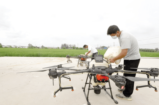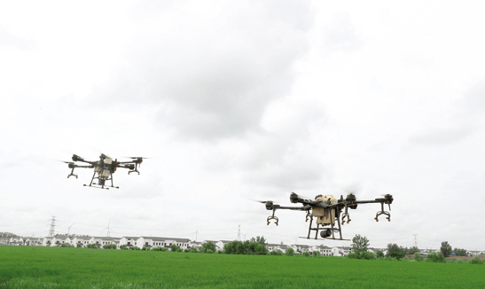 在刘老庄镇瑞和原家庭农场,农机手正在用植保无人机为破口孕穗期的水稻进行飞防作业