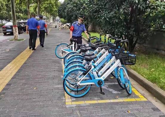执法队员对违停单车进行管控