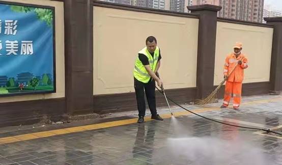 环卫工人对路面进行冲洗