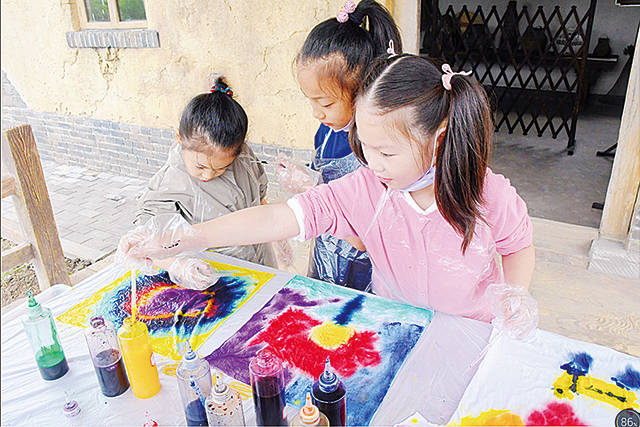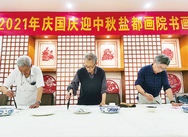 中秋假期,盐都区各地干群开展丰富多彩的活动,品味文化,传递温情,营造浓厚的节日气氛。图一为盐都画院组织书画家泼墨挥毫迎中秋。图二为大冈镇街头正在热销传统赏月食品。图三为游客在草房子乐园体验“传统技艺感受扎染之美”的手工制作大餐。